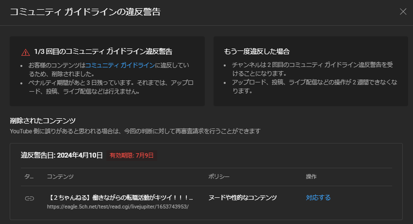 現在、YouTubeのコミュニティ違反のペナルティで動画が投稿できなくなっております…
